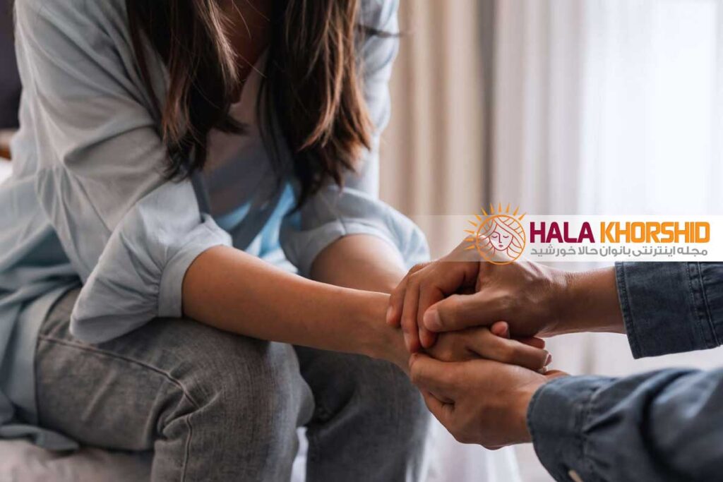 - از لمس حمایتی استفاده کنید، مثلا گذاشتن دست روی بازو یا شانه همسر به آرامش گفتگو کمک زیادی میکند.